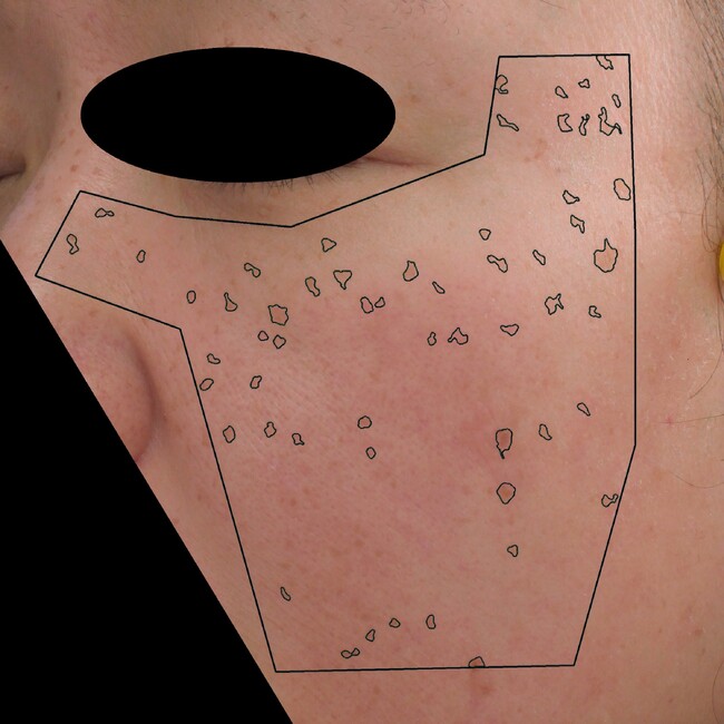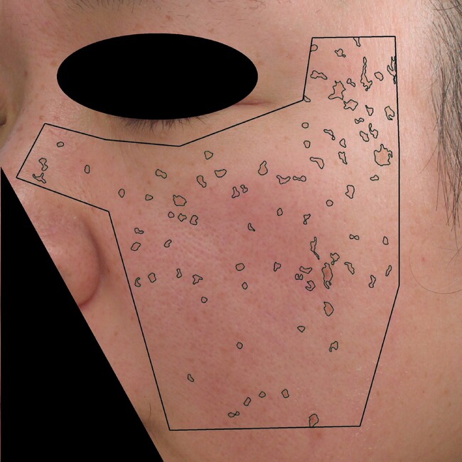 そこで、当社のRJとナイアシンアミドを配合したエイジングケア美容液が肌にどのような効果をもたらすかを検証するために、シミやくすみなどの肌悩みを持つ40~78歳の健康な女性17人(平均60.7歳)に同美容液を朝晩1日2回、普段使用している化粧品と併用してもらい、シミの個数や目尻のシワの状態を測定し、VASアンケート※によって主観的な肌状態を調べました。