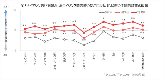 また、主観的な肌評価についても「目元のシワ」「シミ・そばかす」「くすみ」などを含むすべてで改善がみられました。
