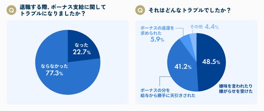 - ボーナス支給のタイミングで退職・転職を申し出た人の内、22.7%が「ボーナスの分を給与から勝手に天引きされた」といったトラブルに遭っていると回答