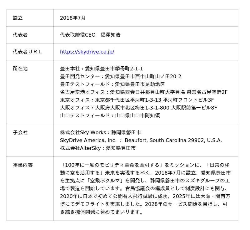 「空飛ぶクルマ」の事業・技術連携に関する協定締結について https://skydrive.co.jp/archives/13733