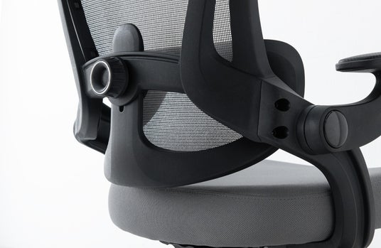 肘掛けのついているオフィスチェアは肘掛けの高さ次第で、デスクの天板や引き出しと干渉し、デスク下にチェアを収納できないことがあります。本製品の肘掛けには“跳ね上げ式アームレスト”を採用することで、デスクとの干渉を防ぎデスク下への収納を可能にします。