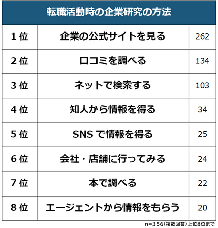 最後に、転職活動時に企業研究をしたと回答した356人に「転職活動時の企業研究の方法」を聞きました。