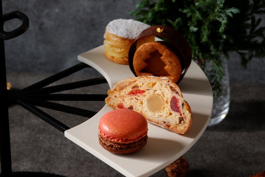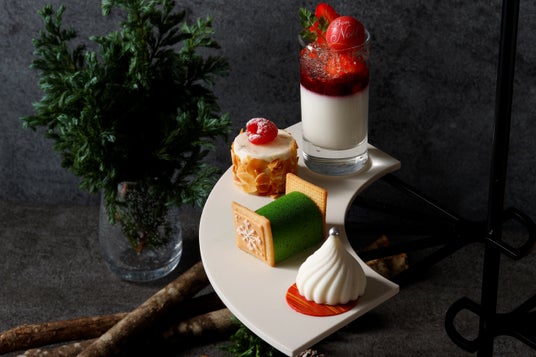 スイーツは、カカオ分66%のビターなチョコレートムースに、シナモンやナツメグなどスパイスたっぷりのビスキュイと繊細なチョコレートリングをあしらった「スパイシーなムースショコラ」や、ピスタチオのババロアを小さなブッシュドノエルに見立てた「ピスタチオのブッシュ」、はちみつのムースに6種のドライフルーツを混ぜ込み、食感のアクセントにアーモンドのヌガーをまぶした「ムースモンテリマール」など、心がほぐれるような味わいと、華やかな見た目の8品を、セイボリーは、クリスマスの定番料理「ローストチキン」や、ピスタチオをまとったフォアグラにいちごのソースの甘酸っぱさを添えた「フォアグラのムース」など3品をご用意し、扇形のティースタンドをオーナメントのように華やかに彩ります。
