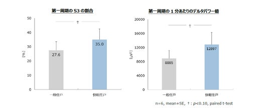 睡眠への課題感を感じている被験者において、最高の睡眠環境を構築した「快眠のための家」の方が一晩の睡眠の中で最も重要な入眠直後に約90分持続するノンレム睡眠、すなわち「黄金の90分の睡眠」が深くなり睡眠の質が向上する傾向が示唆されました。