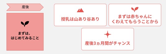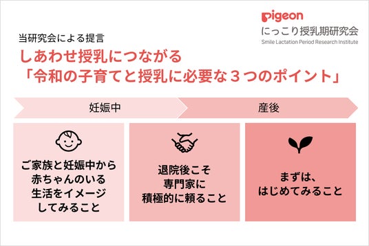 特に育児を始めて間もない0~5ヵ月児の母親にとって、子どもの育児について最も頭の中を占めている「授乳」(※2)がしあわせであるために、「令和の子育てと授乳に必要な3つのポイント」をまとめました。ポイントは「ご家族と妊娠中から赤ちゃんのいる生活をイメージしてみること」「退院後こそ、専門家に積極的に頼ること」「まずは、はじめてみること」の3点です。妊娠中の準備不足が課題である一方、妊婦さんの多くがこれから迎える出産を不安に思い、頭がいっぱいになりがちです。産後の生活を想像して、ワクワクしてほしいと考えています。具体的には、妊娠中に起こる体とこころの変化に目を向け、新しく自分たちらしい家族関係を築いていくことを想像すること、赤ちゃんの育つパワーを感じ、親子のふれあい・コミュニケーションである授乳を楽しみ思うことなどです。