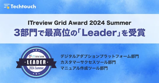 テックタッチ株式会社(本社:東京都港区、代表取締役 CEO:井無田仲、以下 当社)が提供・開発するシステム利活用プラットフォーム「テックタッチ」が、IT製品レビュープラットフォーム「ITreview」で発表された「ITreview Grid Award 2024 Summer」において、ユーザーから認知度・満足度共に優れた製品であると評価され、「オンボーディング・デジタルアダプション部門」「カスタマーサクセス部門」「マニュアル作成・編集」の3部門で最高位である「Leader」を受賞したことをお知らせします。なお、今回で「オンボーディング・デジタルアダプション部門」「マニュアル作成・編集」は6期連続での受賞となります。