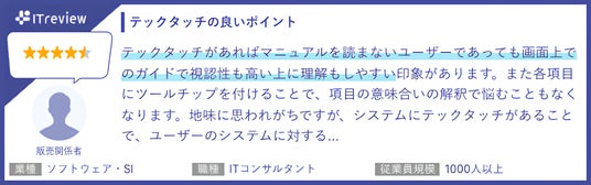 ・本来であればシステム改修が必要であったものを、「テックタッチ」を使用することで改修にかかる費用を削減し、さらに短期間で対応することが可能など、「テックタッチ」の操作性や、ユーザビリティの向上について、高い評価をいただいたことなどが、このたびの受賞の理由となりました。