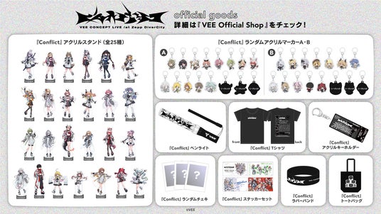 株式会社ソニー・ミュージックエンタテインメント(本社:東京都千代田区、代表取締役社長:村松 俊亮)は、バーチャルタレント育成&マネジメントプロジェクト「VEE」の公式オンラインショップ「VEE Official Shop」にて、2025年3月24日に開催した「VEE 2nd CONCEPT LIVE『Conflict』」で発売したイベントグッズの事後通信販売を開始したことをお知らせします。