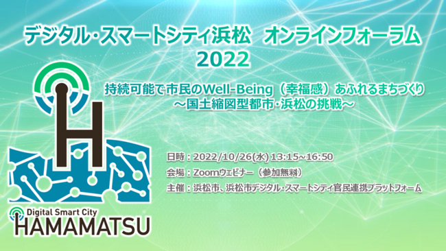 このたび、デジタル・スマートシティ浜松の取組を内外に発信するとともに、浜松デジタル・スマートシティ MONTH における主催事業として、オンラインフォーラムを下記のとおり開催いたします。