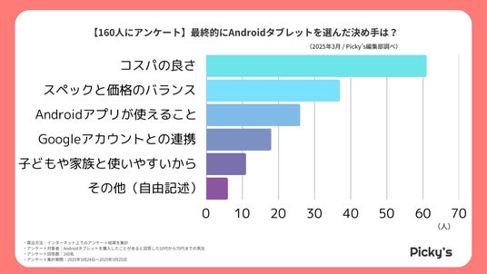 Androidタブレット購入者160名へのアンケート結果から、最も多くの人が選んだ決め手は「コスパの良さ(61件)」でした。