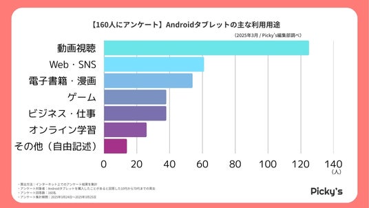 160名のAndroidタブレット購入者を対象としたアンケートでは、最も多く利用されている用途は「動画視聴(125件)」で圧倒的な支持を集めました。