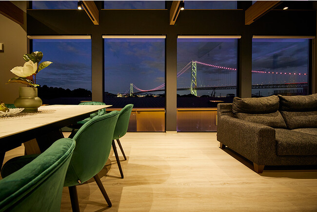 客室の2階部分に位置するリビングスペースからは、ライトアップされた明石海峡大橋を一望する絶景。