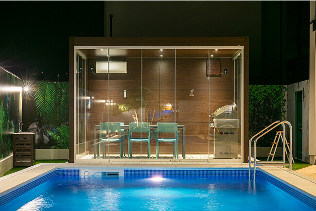 プライベートプールを配置するガーデンには、ガラス張りのBBQスペースをご用意しております。