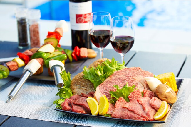 お食事のBBQは専用のグラスガーデン内でご堪能いただけます。宮崎県の有田牧場より取り寄せた”A4ランク宮崎牛”をメインとした、 こだわり抜いた食材をふんだんに使用した贅沢BBQメニューをご用意いたします。