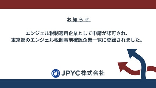 日本円ステーブルコイン『JPYC』を取り扱うJPYC株式会社(東京都千代田区、代表取締役:岡部 典孝)は、経済産業省が推進するエンジェル税制制度に賛同し、優遇措置A・Bの適格企業として東京都労働産業局に申請を行い、これを受理されました。エンジェル税制事前確認企業一覧に掲載されましたので、お知らせいたします。