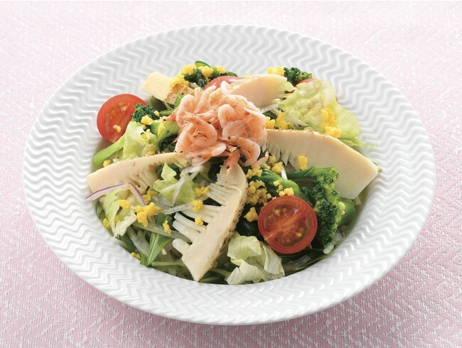 果実に匹敵するほどの糖度を誇るフルーツトマトの発祥の地である高知県。サラダ専門店が厳選した菜の花や筍などの旬の野菜に、高知県佐川町の「ましまファーム」が生産するフルーツミニトマトをトッピングしました。