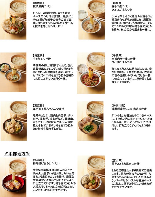 この春、丸亀製麺の「打ち立て・生」をさらにおいしくお届けするために、全国すべての店に麺職人※2の配置が完了しました。 「わがまち釜揚げうどん47」は、全国の麺職人の「お店に来てくださる地元のお客さまがわくわくするような、その地域だけの特別なうどんはつくれないだろうか」という想いから、創業以来の看板商品である『釜揚げうどん』の「つけ汁」を考案しました。麺職人が考案した「つけ汁」は、毎日おいしいうどんを打つ麺職人のうどんへの深い知識と豊かな感性、そして「お客さまにおいしいうどんをお届けしたい」という熱い想いから生まれました。