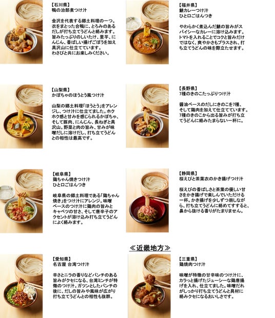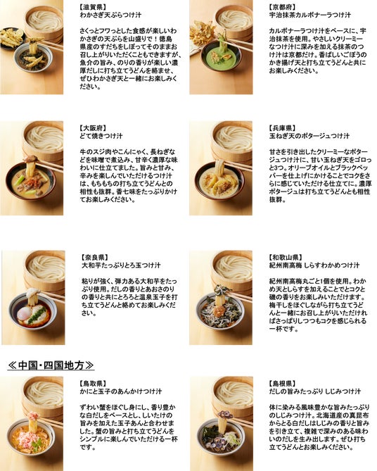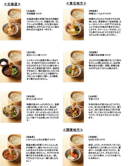 47都道府県の食文化に敬意を払い、うどんに最高に合うよう仕立てられた「つけ汁」は、まさに麺職人のうどん愛と地元愛の結晶です。それぞれの食文化を活かした「つけ汁」で食べる、打ち立て・茹でたての『釜揚げうどん』は、その地域だけで、そして今しか食べることのできない、麺職人の想いが込められた格別な味わいです。