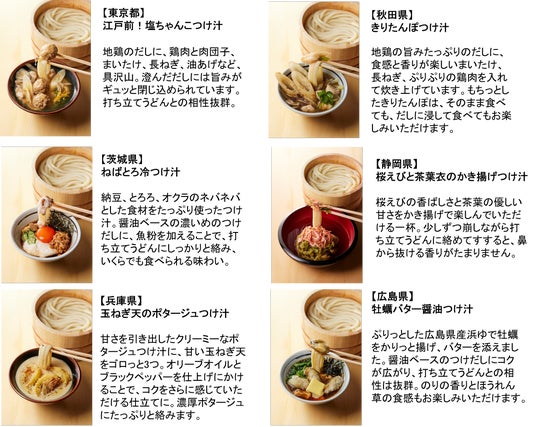 国産小麦、塩、水のみからつくる「打ち立て・生」のうどんに最高に合う、それぞれの地元の食文化を活かした「つけ汁」をお楽しみください。