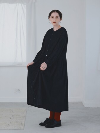細やかなギャザーを贅沢にあしらい女性らしいフォルムのギャザーワンピース。レディなワンピースとしては勿論、ライトなアウターとしても活躍する1枚です。