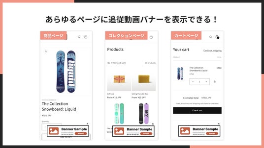 Shopify アプリである「シンプル追従動画バナー|フローティング動画バナー」は、以下のように店舗内のすべてのページに追従動画バナーを表示できる革新的なマーケティングツールです。動画コンテンツの力を活用して、訪問者の注目を集め、ブランドメッセージを効果的に伝えることができます。