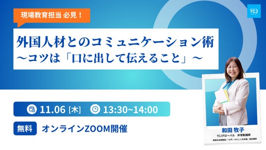 総合日本語教育機関の株式会社TCJグローバル(本社:東京都新宿区、代表取締役社長:中澤 匠)は、外国人材の受け入れに関わる現場担当者を対象に、無料ウェビナー「現場教育担当 必見!外国人材とのコミュニケーション術 ~コツは『口に出して伝えること』~」を2025年11月6日(木)に開催いたします。