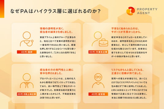 PAが選ばれる背景には、企業としての信用力やアフターフォロー体制に加え、担当エージェントの誠実な姿勢があることが明らかになりました。表面的な利回りだけでなく、「長く付き合える、信頼できるパートナーかどうか」を判断軸とされてPAを選んで頂いていることがうかがえます。