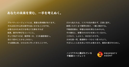 このタグラインとステートメントがPA社員の拠り所となり、さらに多くのお客さまの喜びに繋げることをお約束するとともに、不動産所有が当たり前の社会を創造してまいります。