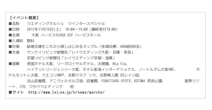 「ウエディングマルシェ ウインタースペシャル」(http://www.lei.ne.jp/h/news/marche/)にどうぞご期待ください。