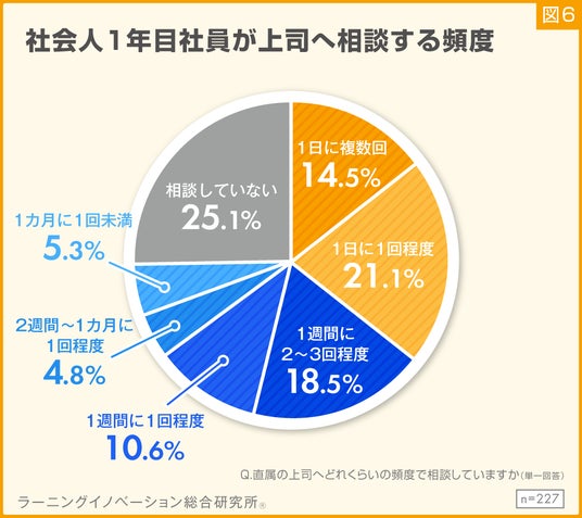 上司とコミュニケーションをとっていても、相談はできていない社会人1年目社員と、1日1回以上の頻度で相談できている社員とでばらつきが生じていました。(図6)