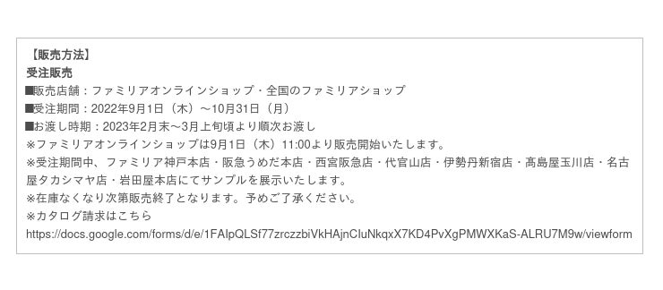 2022年9月1日(木)~ ファミリアオンラインショップ・全国のファミリアショップにて販売開始