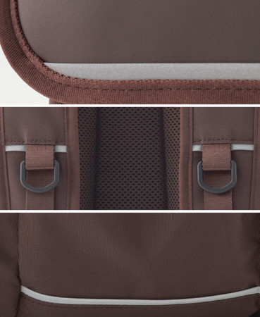 かぶせ下部、肩ベルト、サイドポケット下部に車のライトなどに反射するテープが付いています。