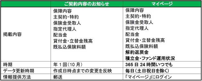2.郵送での「ご契約内容のお知らせ」とご契約者さまウェブサイト「マイページ」の記載情報の比較