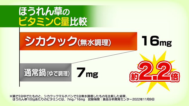 ※2 鍋で3分ゆでたものと、シカクックマルチパンで3分無水調理したものを比較した結果、ほうれん草(100g)のビタミンCは7mg/16mg(約2.2倍)(試験機関:食品分析開発センター2022年11月)