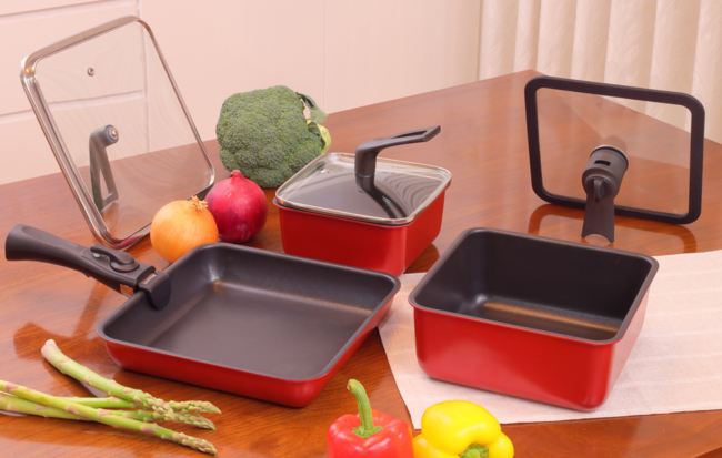 ・材質: マルチパン・フライパン・ミニパン:アルミニウム合金、 ガラスフタ:強化ガラス・シリコン・ステンレス 、 ハンドル:フェノール樹脂・ステンレス・シリコン