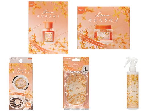 株式会社カーメイト(本社:東京都豊島区)は8月26日(月)、ナチュラルフレグランスシリーズ「luno(ルーノ)」より、好評のキンモクセイの香りを採用したカーフレグランス(全5アイテム)を発売いたしました。人気のリキッド、エアコン取り付け、吊り下げタイプをはじめ、香り立ちの良いゲルタイプやスプレータイプをラインアップ。キンモクセイが開花を迎えるこれからの季節に、車内でもやわらかな秋の香りをお楽しみください。各製品の特長等詳細は以下をご覧ください。