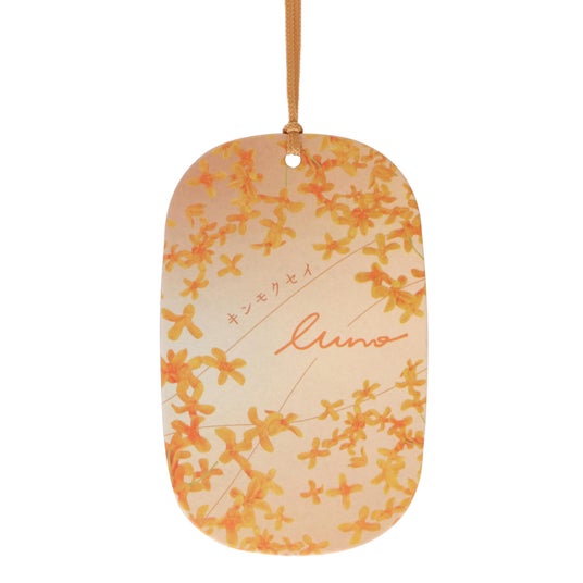 香料を染み込ませたペーパーを3枚1セットに。1枚でほのかに、3枚でしっかりと、使用枚数で香りの強さを調整できます。オレンジ色のグラデーションの中にキンモクセイの花を散りばめたデザインで、やわらかさを演出しました。