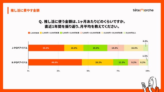 1ヶ月あたり推し活に使う金額は、J-POPアイドルファンの方が、相対的に支出額が多いことが見て取れます。特に、月1万円以上費やす人の割合(計20%)が、K-POPアイドルファン(計7.7%)と比較して顕著に高いことが分かります。