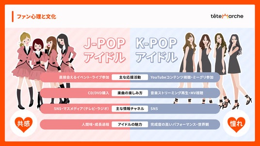 このように、J-POPアイドルのファンは人間味あふれる姿や成長していく過程に心を惹かれ「共感」するのに対し、K-POPアイドルのファンは完成度の高いパフォーマンスやビジュアル、そして独自の世界観に心を奪われ「憧れ」を抱くという、価値観の違いが明らかになりました。