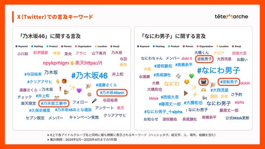 ※ X上で「乃木坂46」・「なにわ男子」と同時に最も頻繁に表示されるキーワード(ハッシュタグ、絵文字、人、場所、組織を含む)※ 集計期間:2024年5月~2025年4月までの1年間