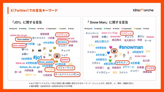 ※ X上で「JO1」・「Snow Man」と同時に最も頻繁に表示されるキーワード(ハッシュタグ、絵文字、人、場所、組織を含む)※ 集計期間:2024年5月~2025年4月までの1年間