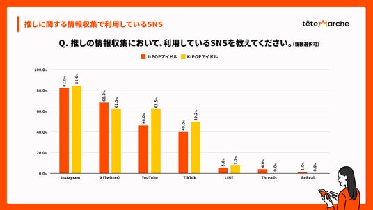 また、アンケート調査の結果によると、K-POPアイドルファンはJ-POPアイドルファンに比べて、推しの情報収集にYouTubeとTikTokを利用する人の割合が高いことが分かりました。