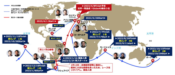 MILAIはClass40というヨットを使用し、8レグ(区間)に分けて世界一周をするレースGlobe40に挑戦しています。第6レグまで優勝を狙えるポジションにいたMILAIは、アルゼンチン沖でのトラブルで、一時は危険な状態にありましたが、なんとか乗り越え、4月8日に世界一周達成し、Globe40で総合3位となりました。