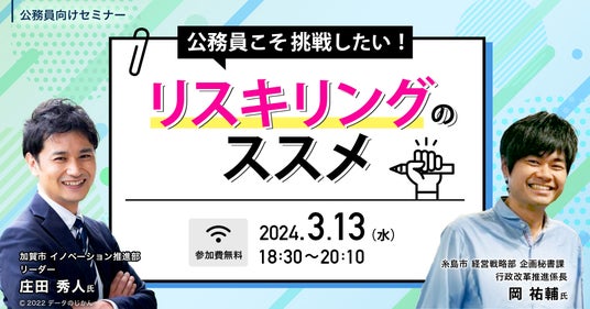 今回のセミナーでは、リスキリングを実践されている現役の自治体職員の方をお招きし、公務員だからこそ活かせるリスキリングのポイントや実体験について、詳細を伺います。