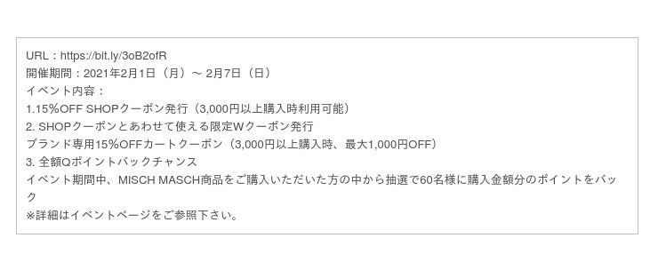 今回のSUPER BRAND RELAYでは、対象商品に使える15%カートクーポン+15%ショップクーポンのWクーポンを発行し、購入額から30%OFFで購入できます。また、MISCH MASCH商品をご購入いただいた方の中から抽選で60名様に、ご購入金額を全額プレゼントする特別イベントを実施します。これからのシーズンに使えるアイテムをお得に揃えることができる、7日間だけのチャンスです。