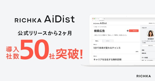 株式会社リチカ(本社:東京都渋谷区 / 代表取締役:松尾幸治 / 以下、当社)は、プロマーケターの業務を再現する生成AIプロダクトを「RICHKA AiDist」として正式に提供後、リリース2ヶ月で導入社数50社突破したことをお知らせします。今後も引き続き「RICHKA AiDist」の機能アップデートを続けて参ります。プロダクトアップデートについて、先行案内申込みを受付中です。(https://docs.google.com/forms/d/e/1FAIpQLSfrEaIXLtkBRiv0kz251IaT8AEVOicMo1TCFBBp8KFrIZLOOg/viewform)
