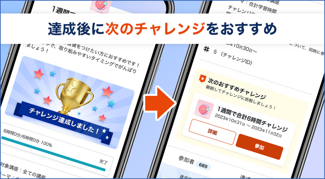 そこで、受講者が学習を続けやすくするために開発したのが「スタディング チャレンジ」です。「スタディング チャレンジ」は、ゲーミフィケーションの手法を取り入れた、小さな成功体験の積み重ねでモチベーションを維持できるという機能です。受講者は日々公開される目標(チャレンジ)に参加し、その達成を目指します。達成すると次のおすすめチャレンジが提示され、さらにチャレンジに参加・クリアしていくことで学習モチベーションが継続します。また、チャレンジに参加する他の受講者の様子も見えるため、勉強仲間のがんばりが相互の励みになります。