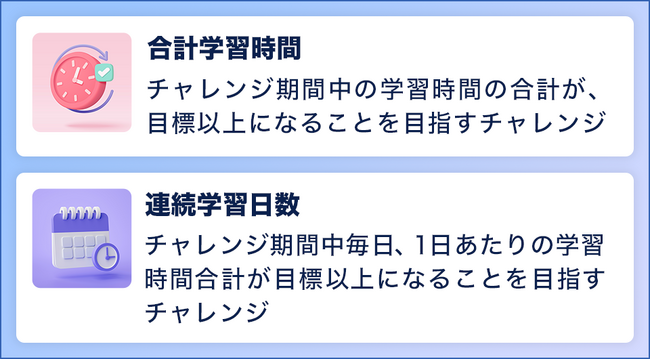 学習スタイルに合わせて取り組めるよう、「合計学習時間」「連続学習日数」という2つのテーマでチャレンジを提供します。それぞれのテーマには、達成しやすいものから少し難しいものまで、幅広いレベルのチャレンジがあります。自分の学習ペースに合ったチャレンジを選んで参加することで、達成感を味わいながら学習を継続できます。