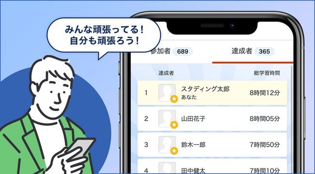 それぞれのチャレンジでは、参加している人数や参加者のニックネーム、達成状況、ランキングが見られるようになっています。自分だけではなく、多くの受講者が日々がんばって学習に取り組んでいることが感じられる仕掛けにより、学習への意欲を後押しします。