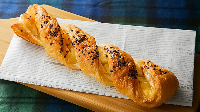 マヨネーズを絞りツイストしたデニッシュに、オニオンチップをのせて焼きました。香ばしいオニオンの風味を楽しめます。大きめで食べ応えのあるデニッシュパンです。